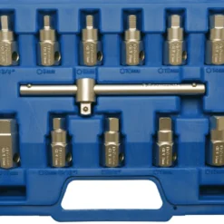 - 7 x Einsätze, Antrieb Innenvierkant 10 mm (3/8″), Abtrieb Innensechskant: 8 – 9 – 10 – 12 – 14 – 17 mm – 3/8″
