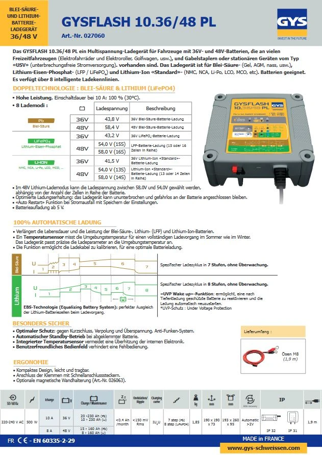 36/48 PL ist ein Profi- Ladegerät für Fahrzeuge mit 36V und 48V für Blei-Säure- und Lithium-Eisen-Phosphat-Batterien (LiFePO4).