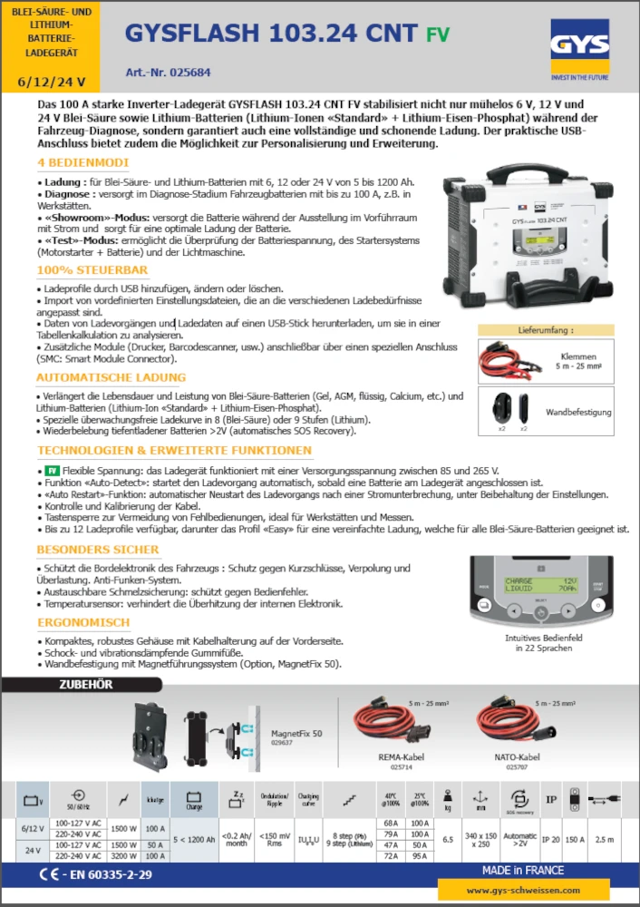 Das 100 A starke Inverter-Ladegerät GYSFLASH 103.24 CNT FV stabilisiert nicht nur mühelos 6 V, 12 V und 24 V Blei-Säure sowie Lithium-Batterien (Lithium-Ionen «Standard» + Lithium-Eisen-Phosphat) während der Fahrzeug-Diagnose, sondern garantiert auch eine vollständige und schonende Ladung. Der praktische USBAnschluss bietet zudem die Möglichkeit zur Personalisierung und Erweiterung.